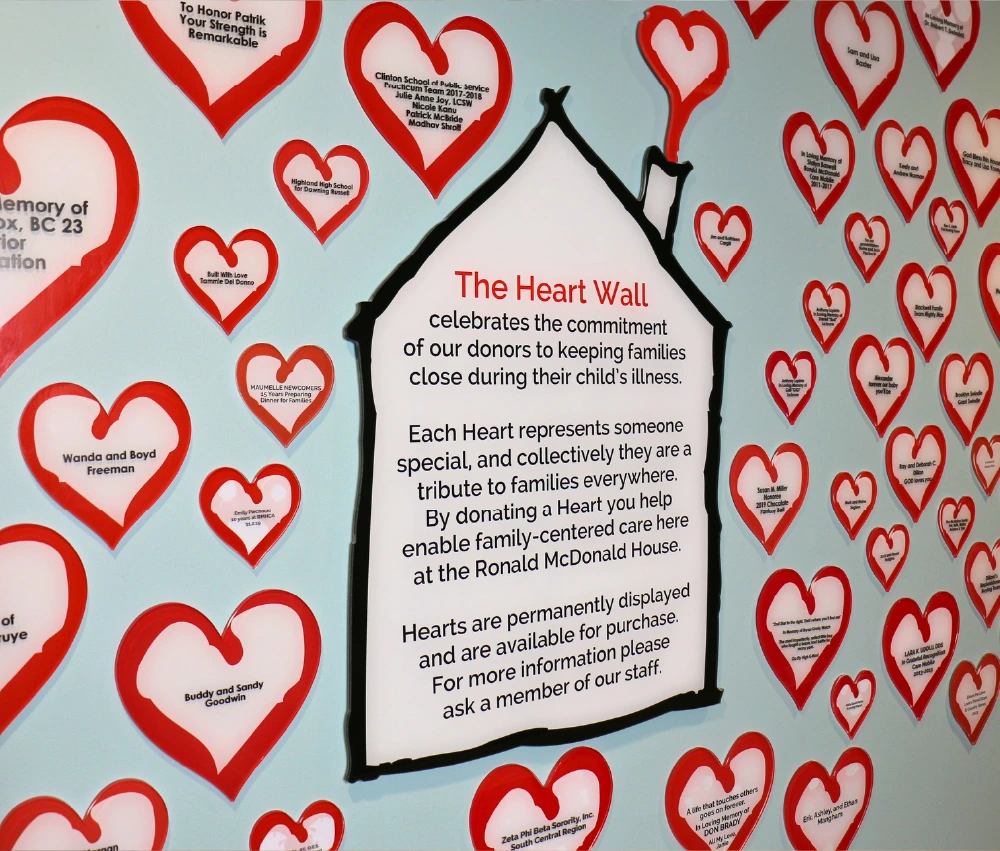 Help support families of ill or injured children by sponsoring a Heart for our Heart Walls. You can honor a special date, celebrate a family member or friend, memorialize a loved one, or show support by listing your name. Your message will be displayed on an acrylic heart that will be featured in perpetuity in the location of your choice. Leave a legacy and lend your heart to support children and their families.